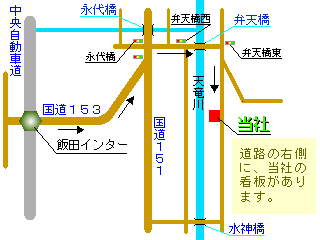 飯田インターを右に出て、国道153号線を道なりに進みます。東鼎出口を降り、2つ目にある永代橋交差点を右折します。そのまま道なりに進み、弁天橋西交差点を弁天橋に向い進路を取り、橋を渡ります。